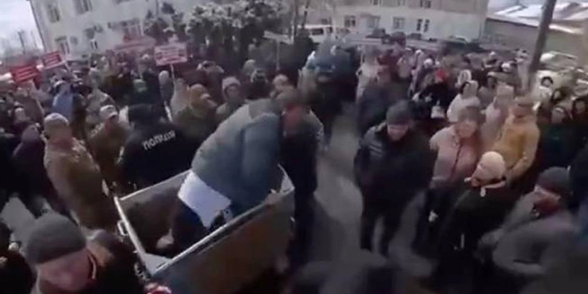 وأظهرت مقاطع فيديو في ساحة مستشفى جيتومير الإقليمي المتعدد التخصصات بأوكرانيا، قيام المحتجين بإلقاء المدير العام بالإنابة للمستشفى، سيرهيي ديموس، في حاوية قمامة، بعد أن طالبوه بإلغاء قرار الإغلاق.