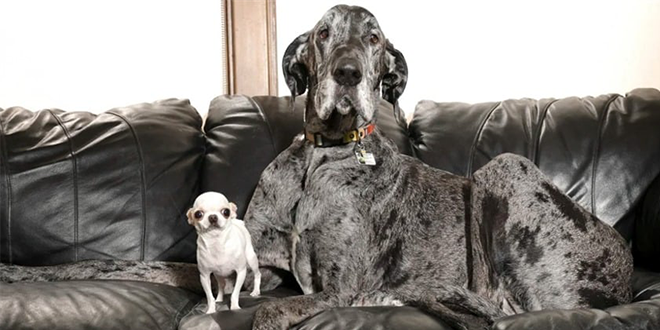 على الرغم من فارق الطول بين الكلبين الأطول والأصغر في العالم والذي يبلغ 91.56 سنتيمتر (3 أقدام)، فقد لعبا معاً بسعادة عندما التقيا لأول مرة.