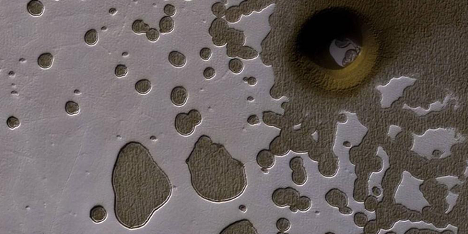 وأضافت التغريدة المرفقة للصورة الغريبة «في الواقع، هناك العديد من الحفر المصورة في هذا المشهد الشبيه بـ«الجبن السويسري»، وجميعها باستثناء واحدة تُظهر تضاريس مريخية مظلمة ومغبرة تحت جليد ثاني أكسيد الكربون الخفيف المتبخر، وتوجد الحفرة الأكثر غرابة في أعلى اليمين، وتمتد نحو 100 متر، ويبدو أنها تخترق مستوى أدنى».وأشار الحساب إلى أن مثل هذه الحفر تُعد ذات أهمية خاصة، لأنها «قد تكون بوابات إلى مستويات أدنى تمتد إلى كهوف واسعة تحت سطح المريخ».