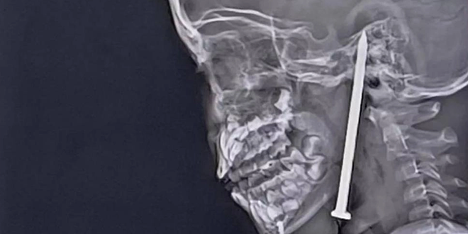 وأظهرت الفحوص بالأشعة المقطعية مدى خطورة الإصابة، ما استدعى تدخلاً جراحياً عاجلاً وتمكنوا من استخراج المسمار من دون التسبب بأي ضرر عصبي مباشر.
