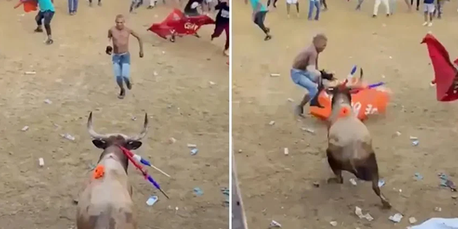 Este es el momento en que un hombre identificado como Yovani Romo fue alcanzado por un toro en las corralejas de Fundación, Magdalena.