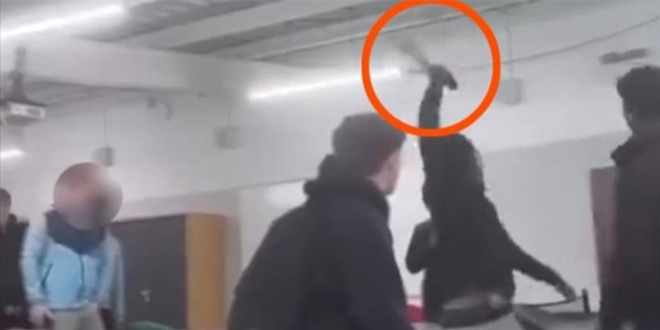 الفيديو الذي انتشر عبر منصة X أظهر الطالب وهو يخرج السلاح من جيبه، قبل أن يبدأ في التلويح به وضرب طاولة داخل الغرفة المشتركة، وسط صرخات ورعب زملائه. وحاول أحد التلاميذ تهدئته، لكنه لم ينجح في السيطرة عليه، فيما اضطر آخرون للابتعاد بسرعة خوفًا من التعرض للطعن، وفقاً لصحيفتي “ذا صن” و”ديلي ميل” البريطانيتين.