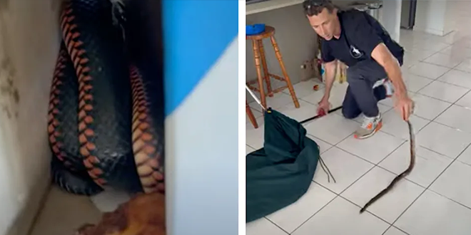 ووفقًا لما ذكرته صحيفة “تايمز أوف إنديا” فقد تسلل الثعبان إلى الداخل واختبأ بجوار سلة المهملات، قبل أن يُستدعى خبير الثعابين المعروف دانييل بوسترا، الشهير بلقب “صائد الثعابين دان”، الذي تمكن من السيطرة عليه وتوثيق اللحظة في مقطع فيديو أثار تفاعلاً واسعاً.