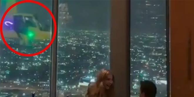 وخلال تناول الثنائي وجبتهما في الطابق الـ71 من برج “U.S. Bank Tower”، فوجئ الجميع بظهور مروحية تحلّق خارج الزجاج مباشرة، تحمل لافتة مضيئة كتب عليها “قالت نعم” مزينة برمز قلب أحمر، في مشهد جذب انتباه جميع الحاضرين داخل القاعة.