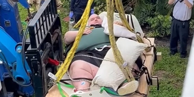 تم إنقاذ رجل يزن حوالي 272 كيلوغراماً من منزله في ولاية فلوريدا باستخدام رافعة ومنصة شحن، في مشهد صادم، ووفق صحيفة “ديلي ميل” فقد تعرّض الرجل لأزمة صحية مفاجئة، ما استدعى تدخّل فرق الإنقاذ بشكل عاجل.