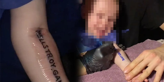 وظهر في المقطع الأبوان وهما يستخدمان آلة وشم لكتابة عبارة “Mellstroy-Game” على ذراع الرضيع، ما أثار استنكاراً واسعاً من المتابعين الذين وصفوا المشهد بالمقزز والمريض.