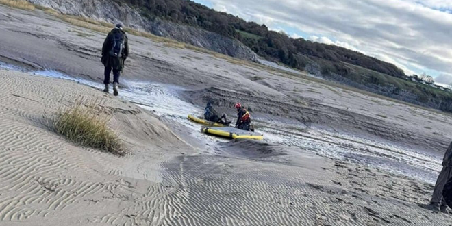 شهدت منطقة سيلفرديل بخليج موركامب في مقاطعة لانكشر البريطانية عملية إنقاذ طارئة بعد العثور على رجل عالق في الرمال المتحركة، لم يظهر من جسده سوى رأسه وصدره وذراع واحدة، بينما كانت مياه المدّ تتدفق بسرعة نحو موقعه.