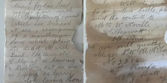 عثرت ديبرا براون، وابنتها فيليسيتي، في أستراليا على رسالتين تعودان إلى عام 1916 داخل زجاجة على شاطئ وارتون بيتش الأسترالي.