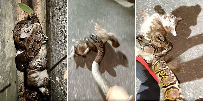 لم يتردد الرجل لحظة، فقبض على ذيل الأفعى وهزّه بقوة في الهواء، حتى أفلتت القطة ونجت بأعجوبة.