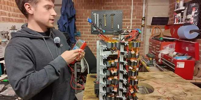 بدلاً من تركها تلوث البيئة، جمع كريس مئات الأجهزة من المتاجر المحلية، فكّكها بعناية، واختبر كل خلية لاختيار الصالح منها، ثم رصّها في وحدات متناسقة باستخدام حوامل مطبوعة بتقنية ثلاثية الأبعاد، على غرار تلك المستخدمة في بطاريات السيارات الكهربائية.