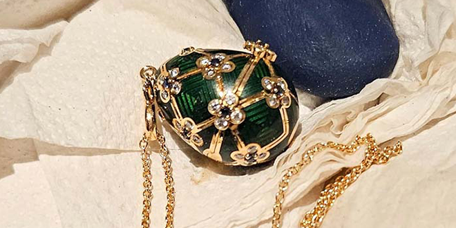القلادة المسروقة ليست مجرد قطعة معدنية عادية، بل هي بيضة فابرجيه مرصّعة بـ 60 ماسة بيضاء، 15 ياقوتة زرقاء، وتفتح البيضة لتكشف عن أخطبوط صغير مصنوع من الذهب عيار 18 قيراطاً، وهي قطعة مستوحاة من فيلم شهير تدور أحداثه حول سرقة بيضة فابرجيه، ما جعل الواقعة تبدو وكأنها مشهد سينمائي حقيقي.