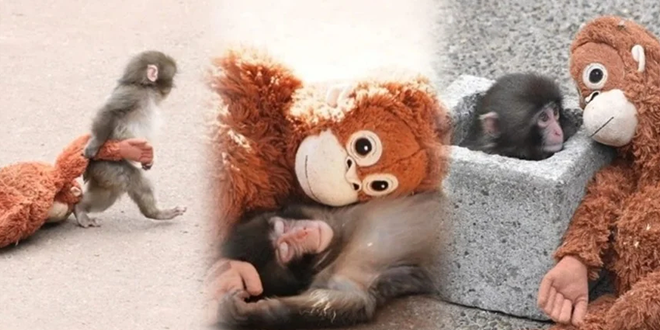 ولكن يحتاج صغار المكاك إلى التعلّق بفراء أمهاتهم منذ الساعات الأولى؛ هذا التلامس يمنحهم الأمان العاطفي ويبني قوتهم العضلية معاً، وحين حُرم بانش من ذلك، جرّب الحارسان بدائل عدة: مناشف ملفوفة ودمى مختلفة، لكن بانش وجد ضالته في دمية “أورانغوتان” كبيرة الحجم؛ فراؤها سهل القبض عليه، وملامحها تشبه وجه قرد.