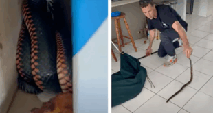 في واقعة غريبة ومثيرة للرعب، اكتشفت أسرة في ولاية كوينزلاند الأسترالية ثعباناً ساماً يختبئ داخل صندوق بيتزا مهمل داخل منزلها، بعدما تُرك الباب الخلفي مفتوحاً. ووفقًا لما ذكرته صحيفة “تايمز أوف إنديا” فقد تسلل الثعبان إلى الداخل واختبأ بجوار سلة المهملات، قبل أن يُستدعى خبير الثعابين المعروف دانييل بوسترا، الشهير بلقب “صائد الثعابين دان”، الذي تمكن من السيطرة عليه وتوثيق …