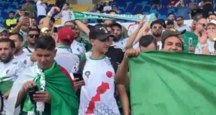 في المباراة التي تجمع المنتخب الجزائري ونظيره الغيني خلال هذه الأثناء على أرضية ملعب محمد الخامس بمدينة الدار البيضاء لحساب التصفيات الأفريقية المؤهلة لنهائيات كأس العالم 2026، التقطت عدسات المصورين صورة لأحد المشجعين المغاربة يرتدي القميص الوطني وهو مزين بخريطة المملكة وسط الجماهير الجزائرية. وتقاطرت بعض الجماهير المغربية إلى ملعب “دونور” لمساندة المنتخب الجزائري للعبور إلى مونديال 2026. وفي وقت …