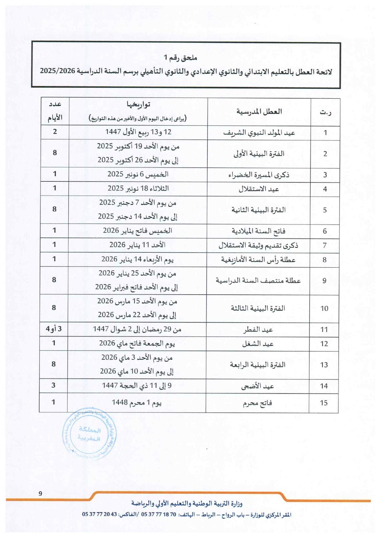 وتضمن المقرر في ملحقه رقم 1 لائحة العطل الخاصة بالتعليم الابتدائي والثانوي الإعدادي والثانوي التأهيلي وأقسام تحضير شهادة التقني العالي برسم السنة الدراسية 2025-2026.