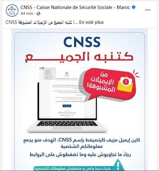 ودعا الصندوق الوطني للضمان الاجتماعي منخرطيه إلى توخي الحذر وعدم الرد على هذه الرسائل، وعدم الضغط على أي رابط مشبوه.