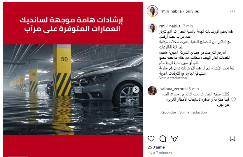 وقالت عمدة الدار البيضاء، نبيلة الرميلي، في منشور على حسبها بموقع “انستغرام”: “هذه بعض الإرشادات الهامة بالنسبة للعمارات التي تتوفر على مرآب تحت أرضي. مع التذكير بأن المصالح المعنية باشرت تدخلات ميدانية لمراقبة البالوعات”.
