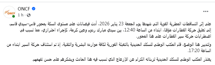 واعتذر المكتب الوطني للسكك الحديدية لزبنائه الكرام عن الإزعاج الذي تسبب فيه هذا الحادث.