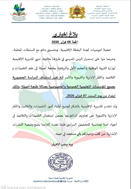 أعلنت المديرية الإقليمية لوزارة التربية الوطنية والتعليم الأولي والرياضة بطنجة أصيلة، مساء اليوم الجمعة، عن استئناف الدراسة الحضورية بجميع المؤسسات التعليمية العمومية والخصوصية، ابتداء من يوم السبت 07 فبراير الجاري.