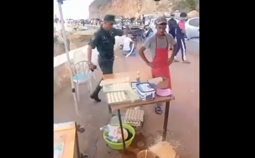 ووفق ما أظهره فيديو الواقعة – والذي أغضب رواد مواقع التواصل الاجتماعي – كان البائع يُحضّر أكلات تقليدية سريعة، على طاولة نصبها في أحد سواحل ولاية تيبازة (73 كيلومترا غرب العاصمة الجزائر)، فيما وضع هاتفه النقال في بث مباشر على يمينه، ليظهر بعد لحظات من البث، رجل أمن دركي، ويطرد الشاب ويشتمه، ويركل طاولته ركلة أسقطتها وما عليها من مأكولات أرضا.