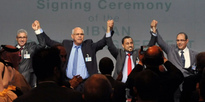 واتفاق الصخيرات نسبة إلى مدينة الصخيرات المغربية؛ تم التوقيع عليه في 17 دجنبر 2015. كان هذا الاتفاق نتيجة لمفاوضات طويلة برعاية الأمم المتحدة لإيجاد حل سياسي للأزمة الليبية وتشكيل حكومة وحدة وطنية.