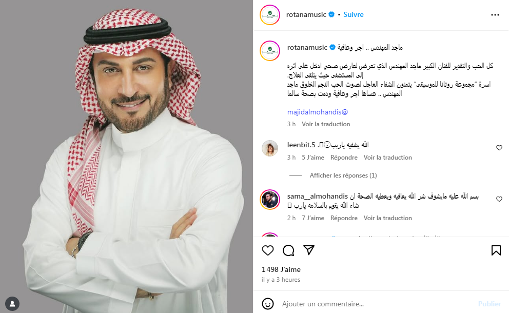 ونشرت “روتانا” صورة للمهندس، أرفقتها بتعليق: “ماجد المهندس.. أجر وعافية. كل الحب والتقدير للفنان الكبير ماجد المهندس، الذي تعرض لعارض صحي ادخل على إثره إلى المستشفى حيث يتلقى العلاج”.