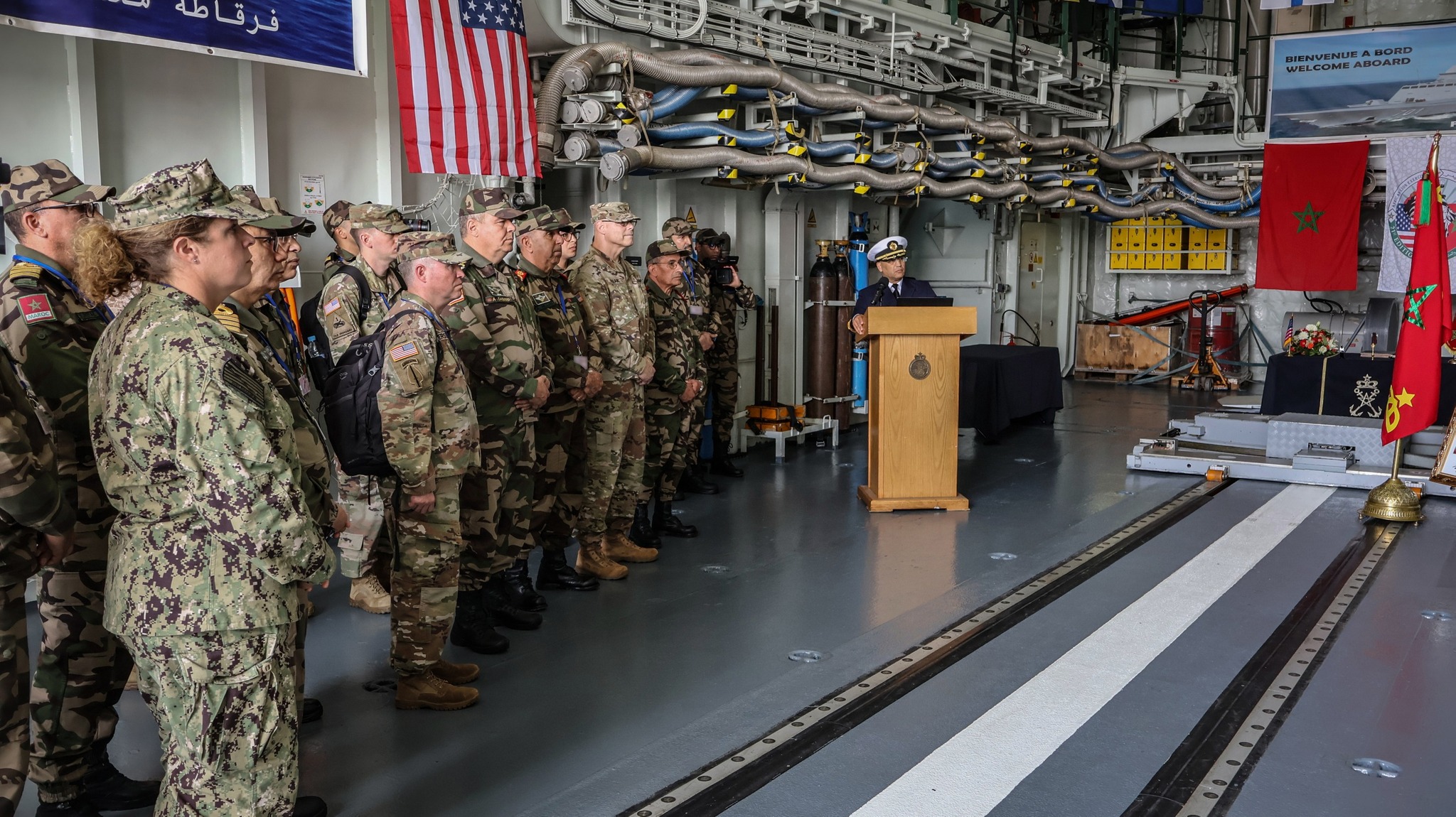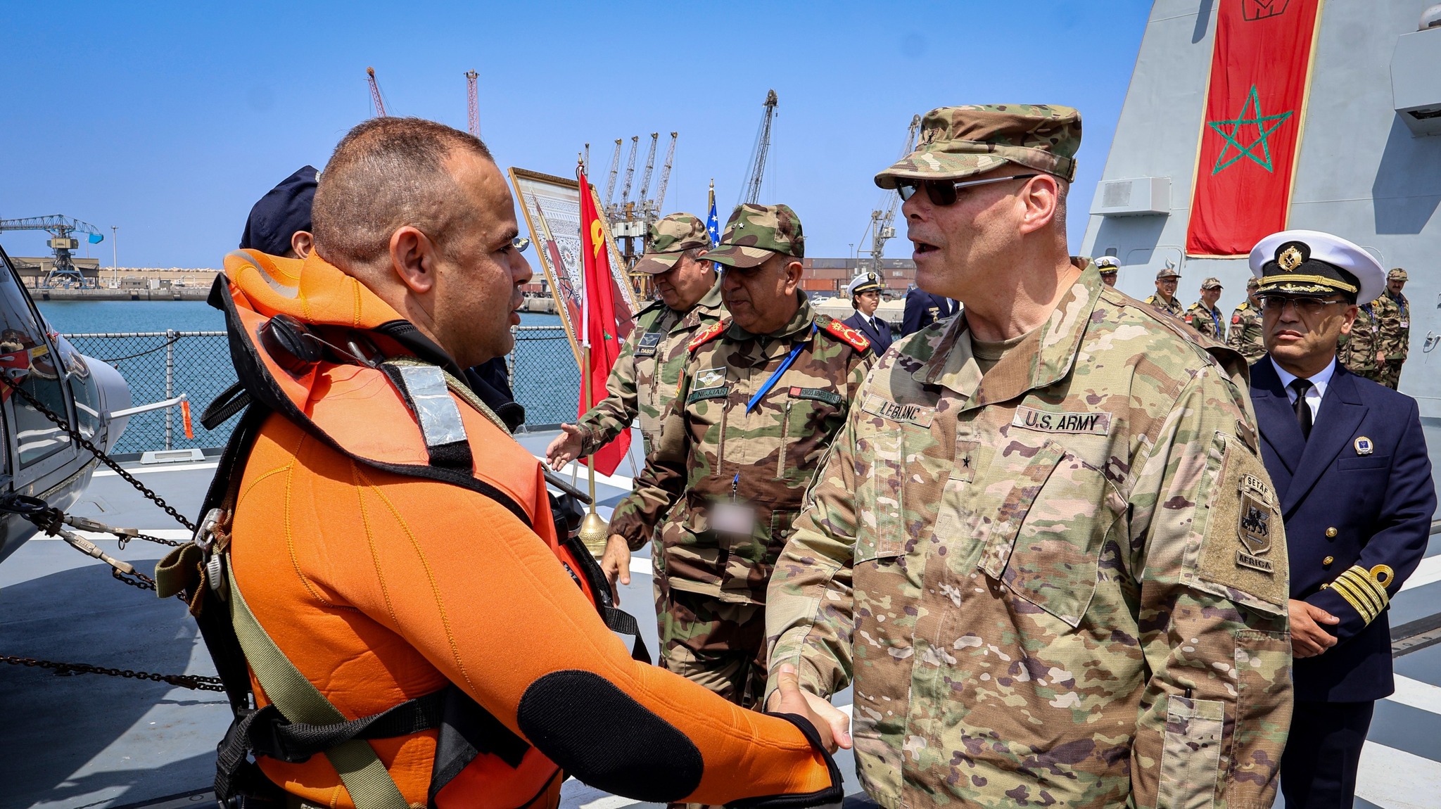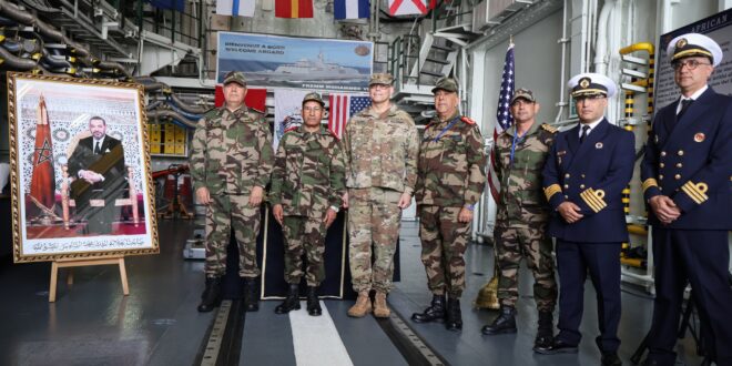 احتضنت الفرقاطة متعددة المهام “محمد السادس” التابعة للبحرية الملكية، يوم الإثنين 19 ماي 2025، نشاطًا رسميًا من نوع Key Leader Engagement جمع قادة عسكريين من المغرب والولايات المتحدة الأمريكية، وذلك في إطار تمرين “الأسد الإفريقي 2025”.