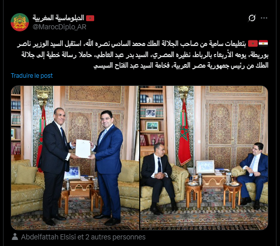 بتعليمات سامية من الملك محمد السادس، استقبل الوزير ناصر بوريطة، وزير الشؤون الخارجية والتعاون الإفريقي والمغاربة المقيمين بالخارج، يومه الأربعاء بالرباط، نظيره المصري، بدر عبد العاطي، حاملا رسالة خطية إلى الملك من رئيس جمهورية مصر العربية، عبد الفتاح السيسي.