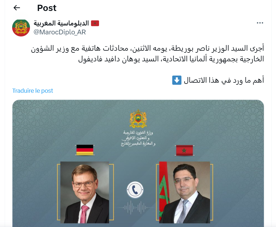 أجرى وزير الشؤون الخارجية والتعاون الإفريقي والمغاربة المقيمين بالخارج، ناصر بوريطة، اليوم الاثنين، محادثات هاتفية مع يوهان دافيد فاديفول، وزير الشؤون الخارجية الجديد لجمهورية ألمانيا الاتحادية.