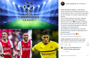 وجه الناخب الوطني, الفرنسي هيرفي رونار, رسالة عبر حسابه الرسمي على أحد مواقع التواصل الإجتماعي ، يعبر من خلالها عن فخره بالثلاثي المغربي الذين خاضوا مباريات دوري أبطال أوروبا مساء الأربعاء رفقة أنديتهم.