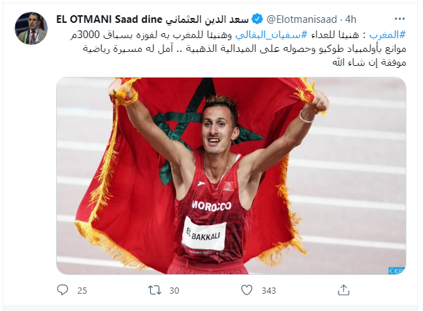 وفي هذا الصدد، كتب سعد الدين العثماني، الأمين العام لحزب العدالة والتنمية رئيس الحكومة، على صفحته الرسمية بموقع التواصل الاجتماعي “تويتر”: “هنيئا للعداء #سفيان_البقالي وهنيئا للمغرب به لفوزه بسباق 3000م موانع بأولمبياد طوكيو وحصوله على الميدالية الذهبية.. آمل له مسيرة رياضية موفقة إن شاء الله”.