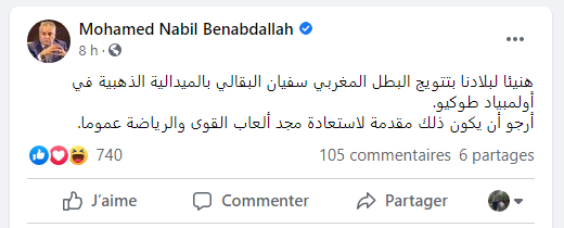 بدوره، قال محمد نبيل بنعبد الله، الأمين العام لحزب التقدم والاشتراكية: “هنيئا لبلادنا بتتويج البطل المغربي سفيان البقالي بالميدالية الذهبية في أولمبياد طوكيو”.