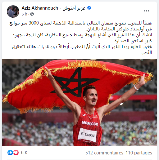 من جهته، قال عزيز أخنوش رئيس حزب التجمع الوطني للأحرار: “هنيئاً للمغرب بتتويج سفيان البقالي بالميدالية الذهبية لسباق 3000 متر موانع في أولمبياد طوكيو المقامة باليابان”.