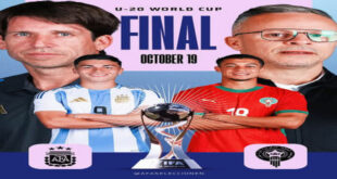 يذكر أن نهائي كأس العالم لأقل من 20 سنة، التي تحتضنها الشيلي، بين المنتخب المغربي ونظيره الأرجنتيني سيجرى بالملعب الوطني خوليو مارتينيز برادانوس بسانتياغو، ابتداء من منتصف ليلة الأحد إلى الاثنين بتوقيت المغرب.