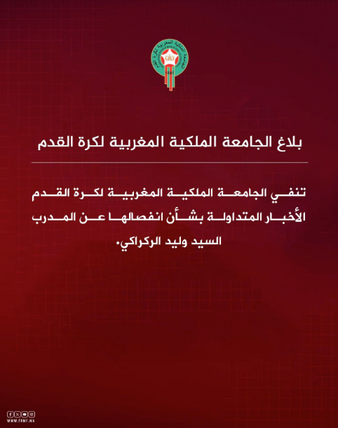 نفت الجامعة الملكية المغربية لكرة القدم في بلاغ مقتضب الأخبار المتداولة، اليوم الثلاثاء 24 فبرابر الجاري، والتي زعمت انفصالها عن المدرب وليد الركراكي.