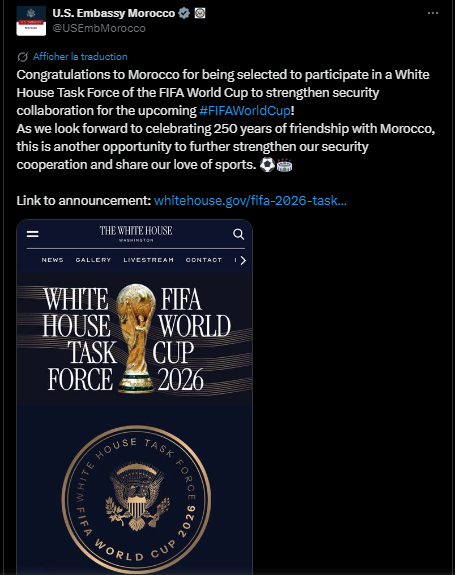 وقالت السفارة الأمريكية في تغريدة على موقع “إكس”، اليوم الثلاثاء: “تهانينا للمغرب على اختياره للمشاركة في فريق العمل التابع للبيت الأبيض الخاص بكأس العالم لكرة القدم، وذلك لتعزيز التعاون الأمني استعدادًا لبطولة كأس العالم المقبلة”.